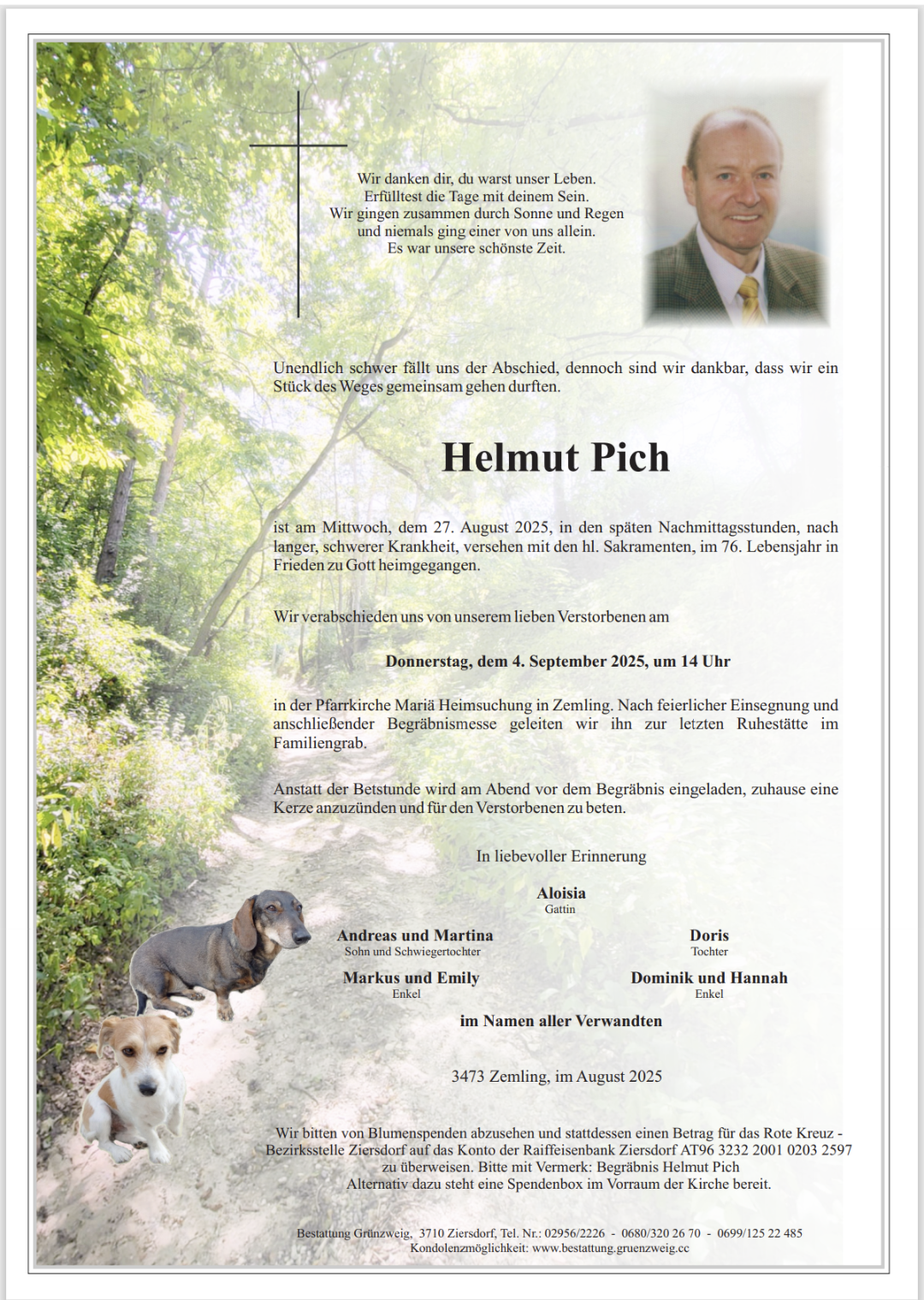 Das Begräbnis findet am 4. September 2025 um 14:00 Uhr in der Pfarrkirche Zemling statt.
